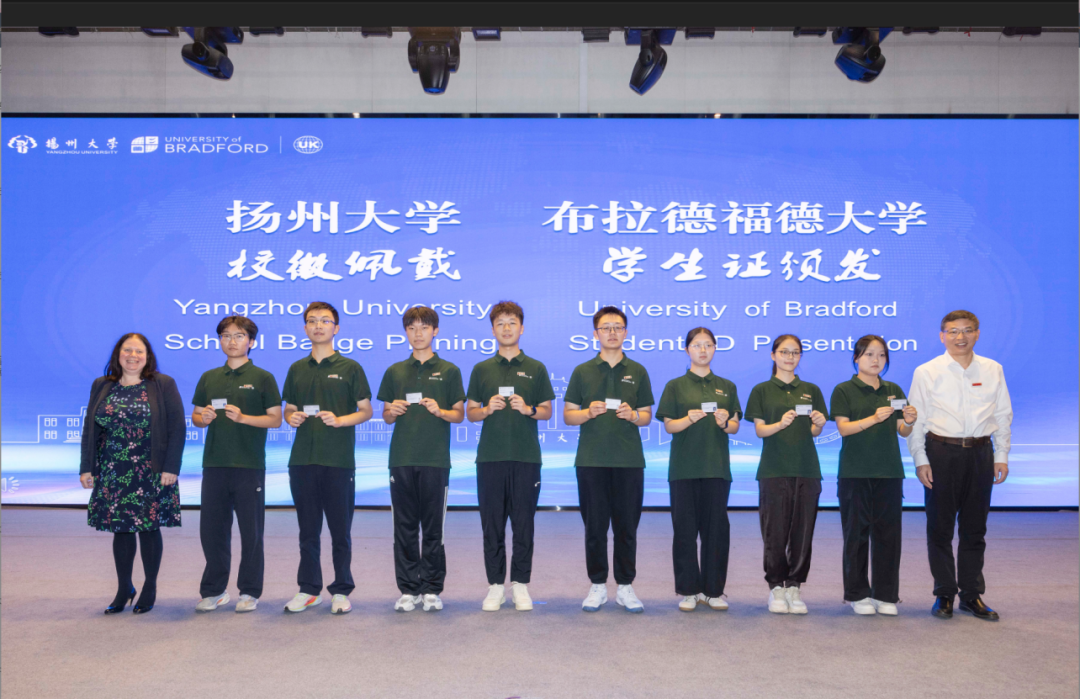 典礼的高潮环节是身份授予仪式。刘巧泉校长庄重地为新生代表佩戴上扬州大学校徽,Claire Pryke女士则为新生代表颁发了布拉德福德大学学生证。这一仪式象征着2025级新生正式成为扬州大学与布拉德福德大学共同培养的学子,肩负起两校的期望与荣光。